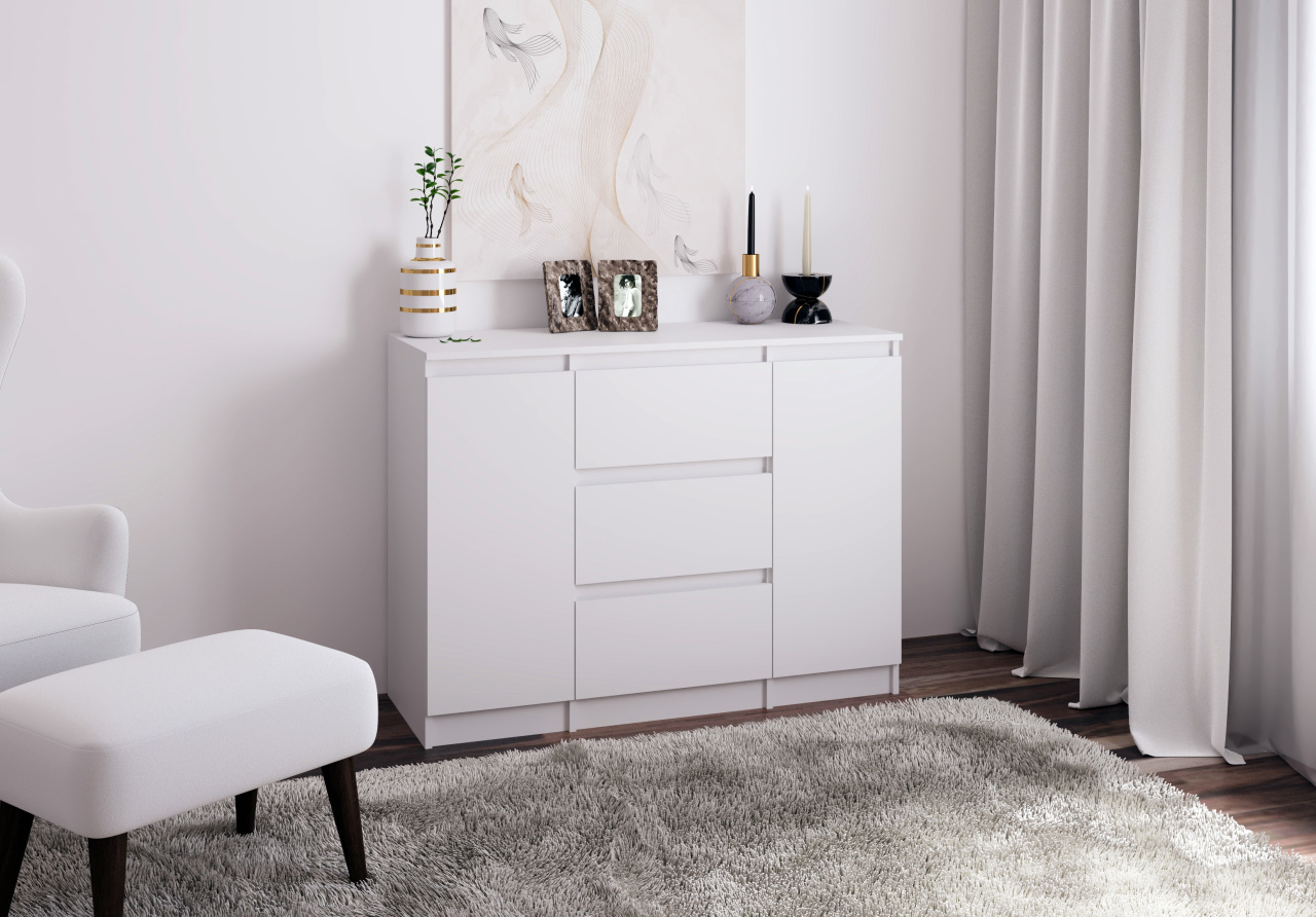 Комод КМ011 — это ответ на запрос покупателя, который не хочет искать компромисс между красотой и функциональностью. Мы объединили три отдельные системы хранения в одном симметричном корпусе, добавили премиальный глянец и убрали все лишнее.